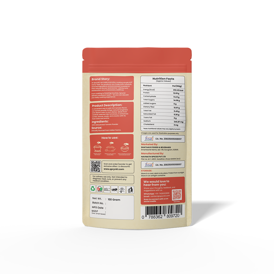 Sprynkl Tomato Powder is made from carefully dehydrated tomatoes and finely ground to preserve their natural tanginess and color. Perfect for gravies, soups, sauces, and seasoning blends, it delivers concentrated tomato flavor without added preservatives.