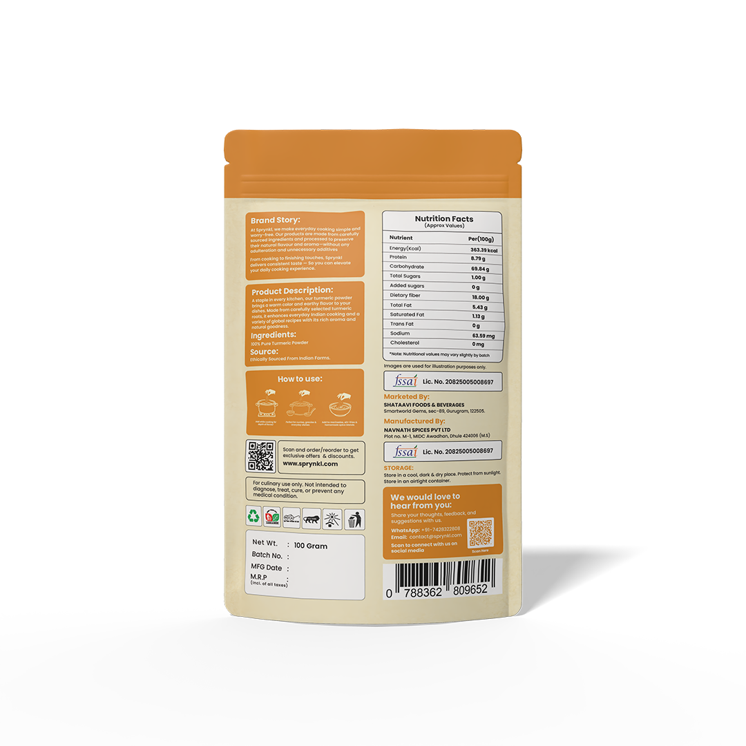 Sprynkl Turmeric Powder is crafted from premium turmeric roots sourced from trusted farms and processed in controlled batches to retain its natural vibrancy and aroma. Ideal for everyday Indian cooking, immunity drinks, and traditional recipes, it delivers consistent flavor without compromise. Every pack is carefully sealed to preserve freshness and purity.