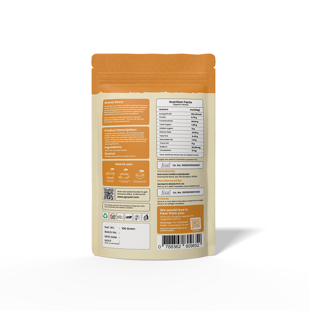 Sprynkl Turmeric Powder is crafted from premium turmeric roots sourced from trusted farms and processed in controlled batches to retain its natural vibrancy and aroma. Ideal for everyday Indian cooking, immunity drinks, and traditional recipes, it delivers consistent flavor without compromise. Every pack is carefully sealed to preserve freshness and purity.